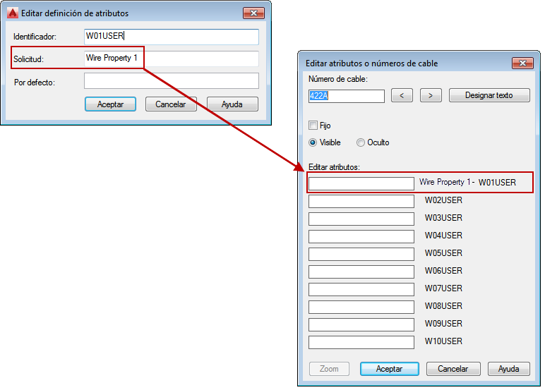 Los bloques de número de cable horizontal y vertical deben incluir un atributo WIRENO. Los bloques también pueden tener los atributos W01USER-W10USER, que se pueden utilizar para asignar varias propiedades al cable. Si desea definir valores de solicitud para cualquiera de los atributos W01USER-W10USER del bloque de número de cable, las solicitudes se deben incluir en la etiqueta cuando se edita el número de cable a fin de asignar valores.