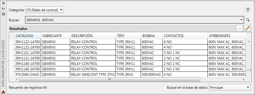 Por ejemplo, al hacer clic en Búsqueda en una bobina de relé sin un valor de catálogo, desea que el Explorador de catálogos busque números de pieza Siemens de relés de "600 V de CA". Edite el archivo de base de datos de catálogo y seleccione la tabla _LISTBOX_DEF. Inserte un registro con los siguientes valores de campos: