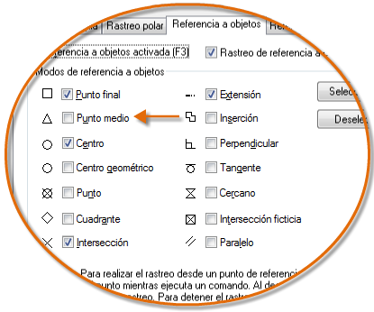 Escriba el comando REFENT para definir la referencia a objetos por defecto, que también se denomina referencia a objetos "en ejecución". Por ejemplo, puede resultar muy útil activar la referencia a objetos de punto medio por defecto.