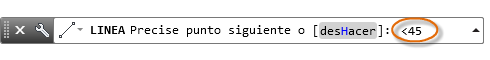 Si necesita dibujar una línea en un ángulo especificado, puede bloquear el ángulo para el siguiente punto. Por ejemplo, si el segundo punto de la línea debe crearse con un ángulo de 45 grados, escriba <45 en la ventana de comandos.