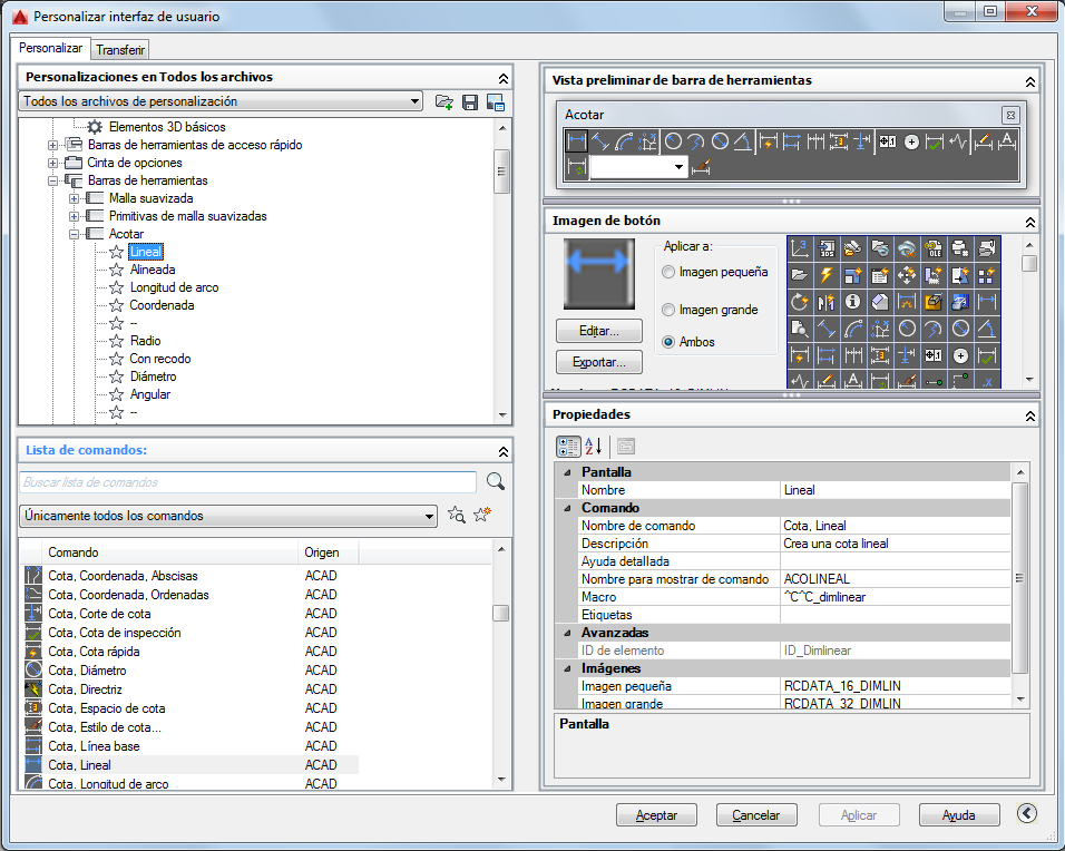 • Imagen grande: precisa el archivo de imágenes grandes que se va a utilizar cuando se añada un comando a una barra de herramientas o un panel de cinta de opciones.