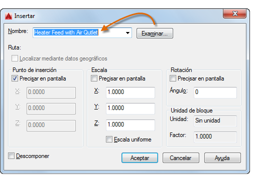Una vez insertado, la definición de bloque se almacena en el dibujo actual. A partir de entonces, puede elegir desde la lista desplegable de Nombre sin necesidad de hacer clic en el botón Examinar.