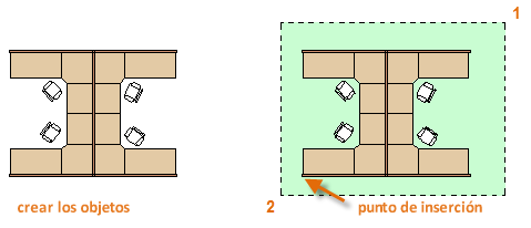Observe que al insertar un bloque, este se enlaza al cursor en el punto indicado. Esta ubicación se denomina punto de inserción. Por defecto, el punto de inserción es el punto de origen (0,0) del dibujo original.