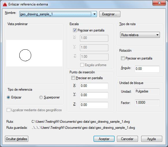Muestra la ruta que se guarda con el dibujo al enlazar la referencia externa. La ruta depende del parámetro Tipo de ruta.