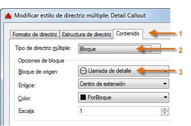 Por ejemplo, para crear un estilo de tipo "llamada de detalle", inicie el comando ESTILDIRECTRIZM. En el Administrador de estilos de directriz múltiple, haga clic en Nuevo y elija un nombre descriptivo para el nuevo estilo de directriz múltiple. Haga clic en la ficha Contenido, seleccione Bloque y, a continuación, Llamada de detalle, como se muestra.