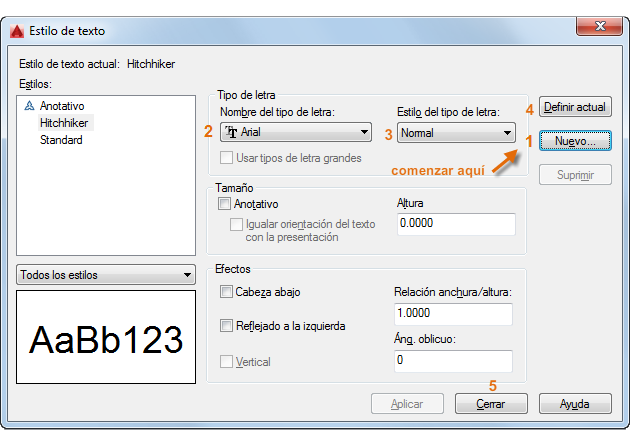 Al crear un estilo de texto nuevo, debe darle un nombre y, a continuación, seleccionar un tipo de letra y su estilo. El orden en el que se debe hacer clic en los botones se muestra a continuación: