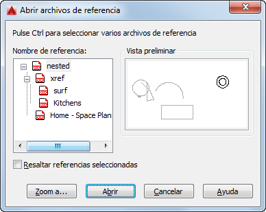 Cierra temporalmente el cuadro de diálogo Abrir archivos de referencia y amplía la vista para mostrar la referencia seleccionada en el área de dibujo. Pulse Intro para volver al cuadro de diálogo.