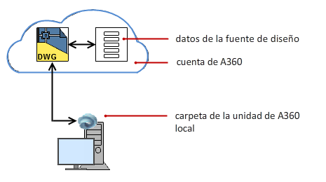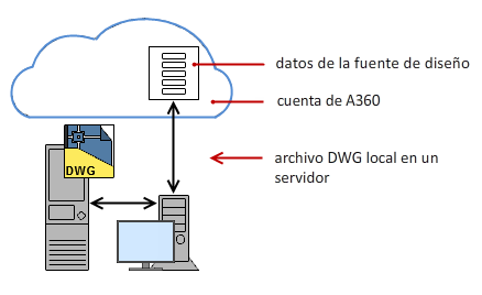 Como alternativa al almacenamiento de archivos de dibujo en la cuenta de A360, puede almacenarlos localmente en el disco duro del ordenador. En este caso, los datos de la fuente de diseño asociados a estos dibujos se siguen almacenando en A360, pero la asociación a los datos de la fuente de diseño se mantiene mediante un ID de fuente de diseño exclusivo, un vínculo a los datos de la fuente de diseño que se incrusta en el dibujo.