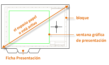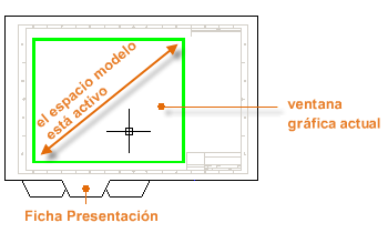 Una ventana gráfica de presentación es un objeto que se crea en el espacio papel para mostrar una vista a escala del espacio modelo. Se puede considerar como un monitor de un circuito cerrado de televisión que muestra parte del espacio modelo. En la ilustración, el espacio modelo está activo y se puede acceder a este desde la ventana gráfica actual de la presentación.