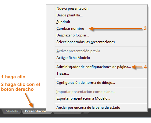 Lo primero que debe hacer al acceder a una ficha Presentación (1) es hacer clic con el botón derecho en la ficha (2) y cambiar su nombre (3) por algo más específico que Presentación 1. En una presentación de tamaño D, ARCH D o ANSI D pueden resultar buenas opciones.