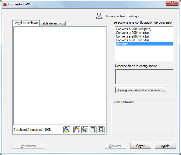 Si se ha asignado una descripción a una configuración de conversión al crearla o modificarla, esa descripción aparecerá en el campo Descripción de la configuración. Haga clic en el botón Configuraciones de conversión para tener acceso al cuadro de diálogo Configuraciones de conversión.