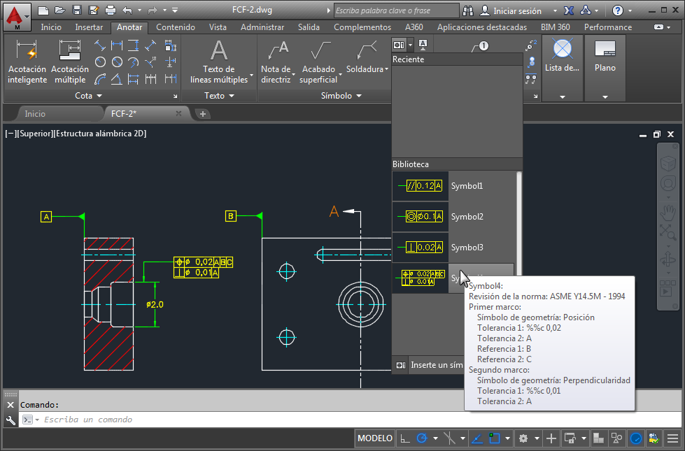 Es posible preconfigurar los símbolos y guardarlos en la biblioteca de símbolos para su reutilización. La biblioteca de símbolos se muestra en el cuadro de diálogo que se muestra al insertar un símbolo en un dibujo. Cuando se selecciona un símbolo de la biblioteca de símbolos, el resto de la información que se escribe en el cuadro de diálogo se rellena automáticamente.
