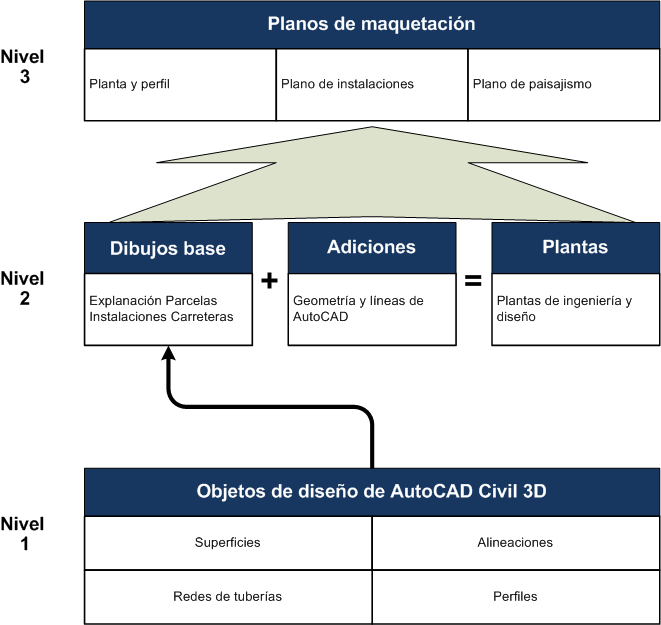 En todos los proyectos, salvo en los más pequeños, es recomendable mantener los dibujos maestros de los objetos de diseño comunes, como las superficies de terreno existente y las alineaciones. En otros dibujos, se puede hacer referencia a estos objetos como copias optimizadas del original, para lo cual se requiere muy poco espacio. La práctica de la referencia también protege los datos de origen de los cambios accidentales, puesto que los objetos de referencia son copias de sólo lectura. Los datos de origen no se pueden cambiar en el dibujo principal.