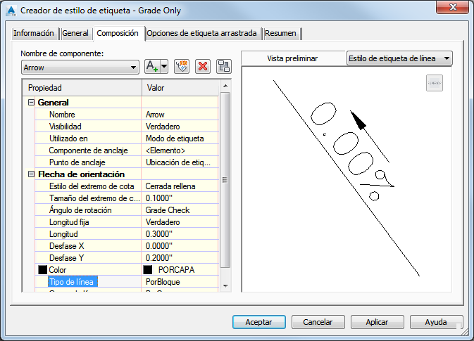 El estilo de etiqueta por defecto Grade Only muestra la pendiente con una flecha de orientación que señala en la dirección de avance de la línea característica.