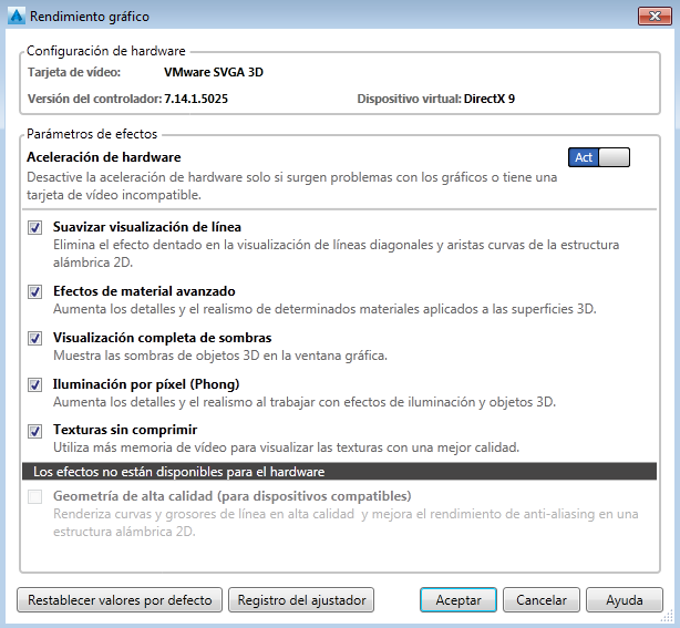 Se puede acceder a la configuración del rendimiento gráfico introduciendo el comando de AutoCAD GRAPHICSCONFIG. De este modo, se abre el cuadro de diálogo Rendimiento gráfico, como se muestra en la figura 15.