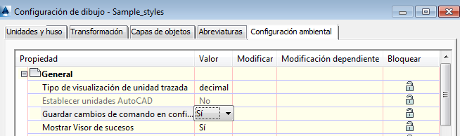 - Haga clic en la ficha Configuración ambiental y expanda la propiedad General. Defina la propiedad Guardar cambios de comando en configuración como sí.