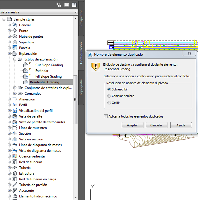 En el ejemplo que se muestra en la figura 9, se ha seleccionado el estilo Estándar de Explanación de Sample_styles.dwg, se ha arrastrado y se ha soltado sobre el nombre Breaklines.dwg.