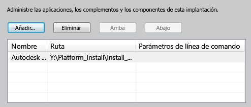 El nombre y la ruta de archivo se añaden a la tabla de administración. Repita este paso para añadir más archivos. Los botones para suprimir archivos y desplazarlos hacia arriba o hacia abajo en la lista se activan cuando la tabla contiene al menos dos archivos. Las barras de desplazamiento horizontal y vertical se añaden cuando la tabla se extiende más allá de la ventana.