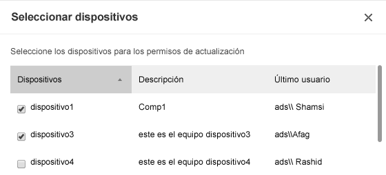 - En el cuadro de diálogo Seleccionar dispositivos, seleccione o anule la selección de la casilla de verificación de cada dispositivo.