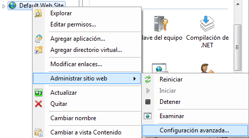- En el cuadro de diálogo Internet Information Services, expanda equipo local ► Sitios, haga clic con el botón derecho en Sitio Web predeterminado y seleccione Modificar enlaces > Administrar sitio Web > Configuración avanzada.