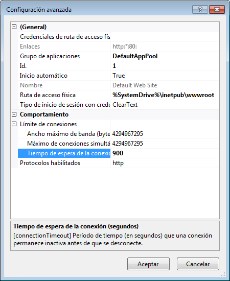 Por defecto, el tiempo de espera de conexión de IIS es 120 segundos. La duración adecuada para Autodesk Vault Server es 900 segundos. Si es necesario realizar algún cambio, aumente la duración del tiempo de espera para IIS.
