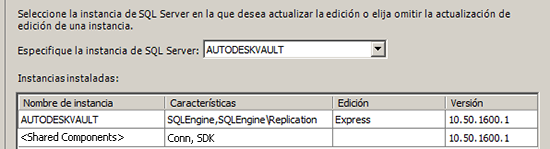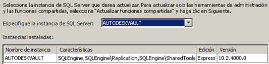 - Seleccione la instancia de AutodeskVault que desee actualizar y confirme su configuración.