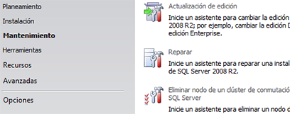 - Inicie Setup.exe desde el soporte de instalación de la versión completa de SQL 2008. Seleccione la opción Mantenimiento e inicie el asistente Actualización de edición.
