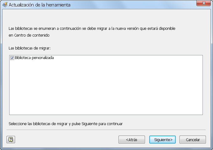 Seleccione la biblioteca que desea actualizar. Si hay más de una biblioteca de usuario obsoleta, se pueden seleccionar varias bibliotecas para que se actualicen en el mismo proceso. Pulse Siguiente.