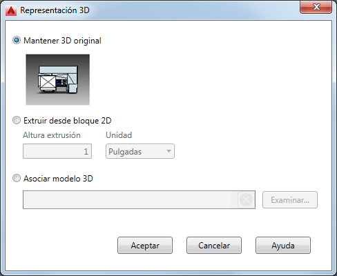 En este tema se describen dos métodos diferentes para crear una representación 3D a partir de un componente de bloque 2D: extrusión a partir de un bloque 2D o asociación de un modelo 3D. Ambos procedimientos se llevan a cabo mediante la opción de menú Representación 3D, que se encuentra en el panel Autor de la ficha Generador de componentes. Una vez que el modelo 3D se ha asociado correctamente al bloque, se puede importar e insertar con la orientación correcta.