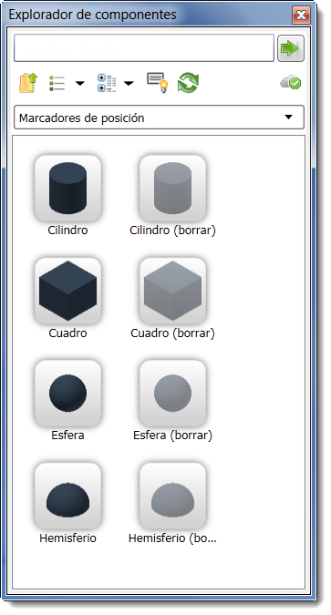 Cuadros sólidos y transparentes, cilindros, esferas y hemisferios se instalan con Factory Design Suite y se almacenan en la carpeta Marcadores de posición de componentes del sistema.