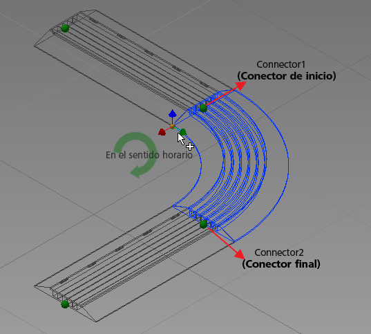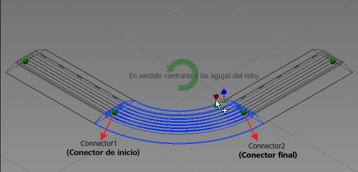 Es importante especificar correctamente los conectores de inicio y final de un segmento de Arc Turn (Giro de arco). Al hacerlo, se determina la correcta dirección de la curva de las cadenas cuando los segmentos 2D se conectan entre sí y se rellenan con componentes 3D en Inventor Factory. Por defecto, el segmento de giro de arco definido para una cadena de componentes se curva en el sentido de las agujas del reloj (giro a derecha).