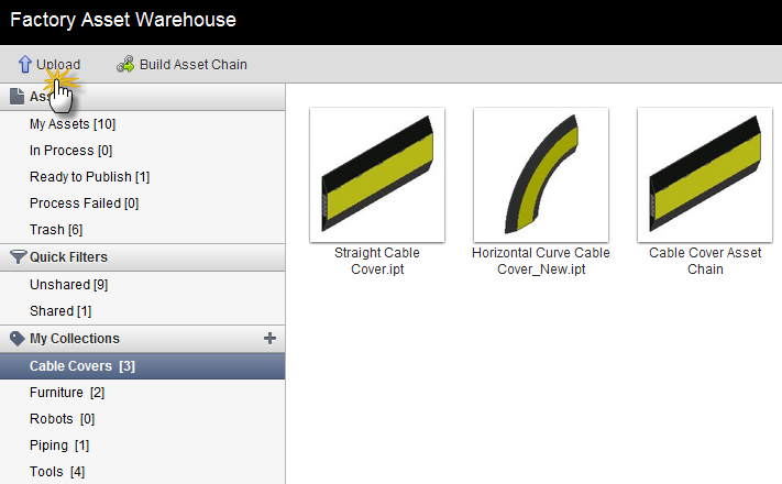 Si no existe ningún modelo del componente disponible en el Almacén de componentes de Factory, haga clic en el botón Cargar de la barra de herramientas. En el cuadro de diálogo emergente, haga clic en Seleccionar archivos, y busque y seleccione los modelos que desee importar en el Almacén de componentes de Factory desde el escritorio. El modelo del componente se importa automáticamente. Puede supervisar el progreso en la ventana In-Process (En proceso).