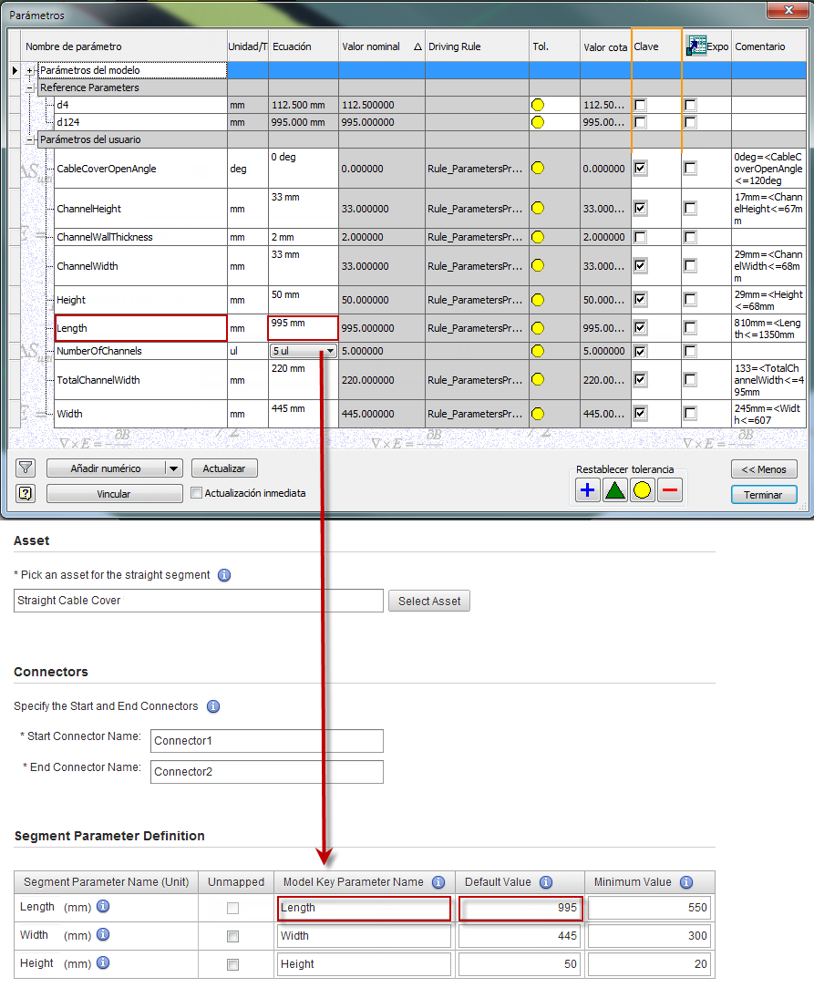 - Crear la asignación de parámetros entre los segmentos de la cadena de componentes y los modelos de la familia.