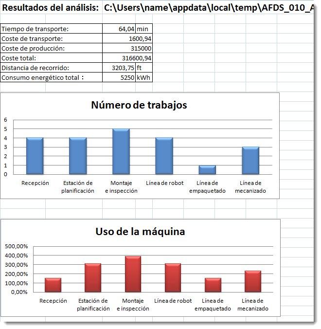 Para los tipos de transporte continuo: Si (tiempo de preparación + tiempo de ciclo) * tamaño de lote < (longitud de la línea de conexión/velocidad) suma de (tiempo de preparación + tiempo de ciclo) * tamaño de lote * coste de transporte de todos los trabajos En caso contrario: suma de (longitud de la línea de conexión/velocidad + tiempo de carga + tiempo de descarga) * [redondeo (cantidad de piezas del trabajo/tamaño de lote)] * coste de transporte de todos los trabajos Para los tipos de transporte no continuo: suma de (longitud de la línea de conexión/velocidad + tiempo de carga + tiempo de descarga) * [redondeo (cantidad de piezas del trabajo/tamaño de lote)] * coste de transporte de todos los trabajos |