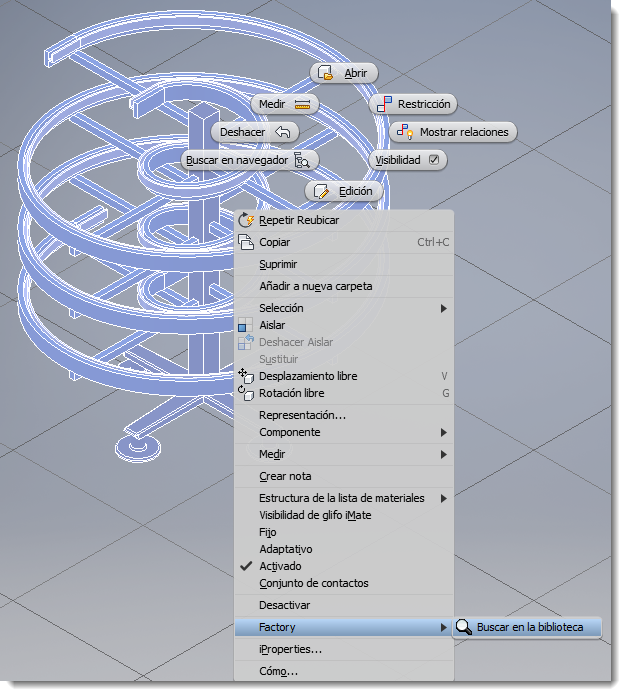 Si necesita averiguar la ubicación de un componente insertado en la biblioteca de componentes (por ejemplo, para editar el componente o realizar copias), haga clic con el botón derecho en el componente en el layout y seleccione Factory > Buscar en la biblioteca: