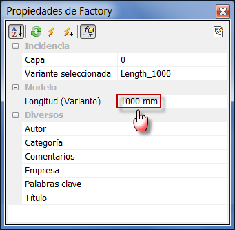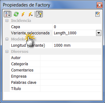 en la parte superior del explorador de propiedades de Factory para activar el nombre de la variante de parámetro del modelo.