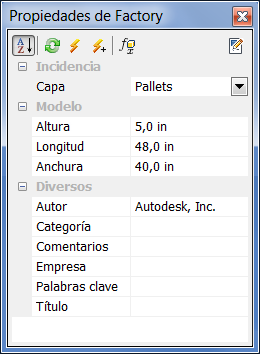 Después de colocar un componente del explorador de componentes, puede seleccionarlo y modificar los parámetros de Modelo o los parámetros de Varios en el explorador de propiedades de Factory. El explorador de propiedades de Factory se muestra automáticamente cuando se crea un nuevo layout. Para activar y desactivar el explorador de propiedades de Factory, haga clic en
