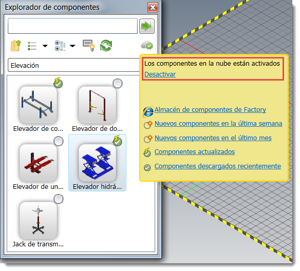 El contenido basado en nube debe activarse para poder descargar componentes basados en nube. Por lo general, el contenido basado en nube está activado por defecto y este icono aparece cerca de la parte superior derecha del explorador de componentes