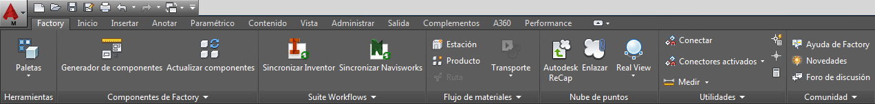 La interfaz de usuario de Factory Design Utilities está ubicada en la ficha Factory y se organiza en grupos denominados Herramientas, Componentes de Factory, Suite Workflows, Flujo de materiales, Nube de puntos, Utilidades y Comunidad. Una combinación de paneles de Factory y AutoCAD estándar crean el entorno de trabajo de Factory por defecto.