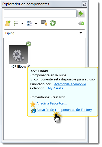 Después de publicar el componente en la nube, este se encuentra disponible para descargar en el explorador de componentes. También se puede acceder al Almacén de componentes de Factory a través del explorador de componentes basados en nube.