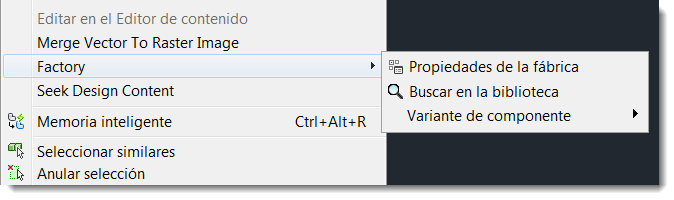 Todos los comandos de menú relacionados con Factory (Propiedades de Factory, Buscar en la biblioteca, Variante de componente y Convertir a componentes) están disponibles al hacer clic con el botón derecho en un componente para visualizar el menú contextual.
