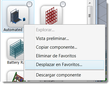 Para desplazar un componente de una carpeta de Favoritos a otra, localice el componente en Favoritos, haga clic con el botón derecho del ratón y seleccione Desplazar en Favoritos. También se puede eliminar un componente de una carpeta desde este menú. Tenga en cuenta que al eliminar un componente de una carpeta de Favoritos, este no se suprime de la biblioteca.