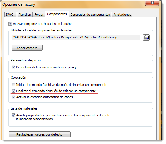 Al colocar un componente, se pueden colocar tantos ejemplares como sea necesario en un comando. Ahora tiene la opción para finalizar el comando después de colocar un componente. El parámetro está disponible en la ficha Componentes de Opciones de Factory en Inventor.