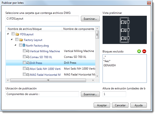 Publicar por lotes permite crear varios componentes a la vez a partir de bloques contenidos en archivos DWG. Esta función resulta útil si administra los bloques agrupándolos en archivos independientes actualmente y desea convertirlos en componentes de la fábrica.