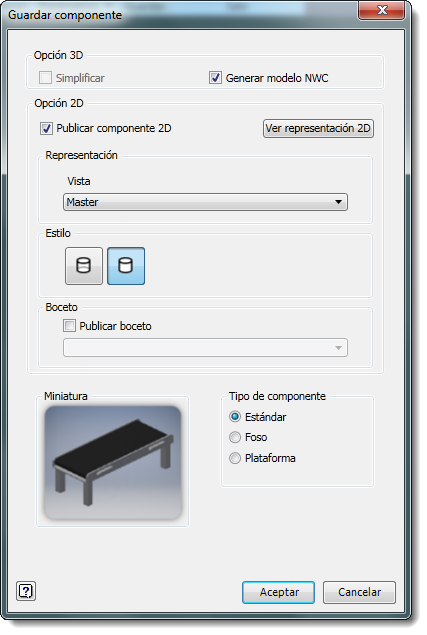 - Active la casilla de verificación Publicar componente 2D para publicar un dibujo 2D (en formato DWG) del componente. La publicación de un dibujo 2D de un componente 3D crea un componente 2D para su uso en AutoCAD Factory. El componente se coloca automáticamente en la carpeta de usuario del Explorador de componentes de AutoCAD Factory. Haga clic en el botón Ver representación 2D para obtener una vista preliminar de una versión 2D del componente.