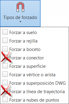- Comience activando las opciones Forzar a vértice o arista y Forzar a línea de trayectoria del menú desplegable Tipos de forzado en el panel Opciones. Desactive el resto de opciones de forzado del menú.