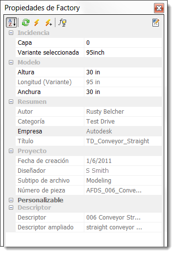 propiedades de Factory se rellena con los datos de los componentes cuando se selecciona un componente parametrizado en un ensamblaje de layout de la fábrica. La información se organiza en las siguientes categorías. Si un campo aparece atenuado, el valor no se puede cambiar. Si un componente no está definido en una categoría, la categoría no se muestra.