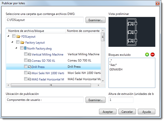 Convierta de forma rápida y sencilla los bloques de los archivos DWG existentes en componentes de la fábrica. Haga clic en Publicar por lotes para ver los archivos DWG con la estructura de archivos actual y seleccione uno o varios bloques que desee convertir.