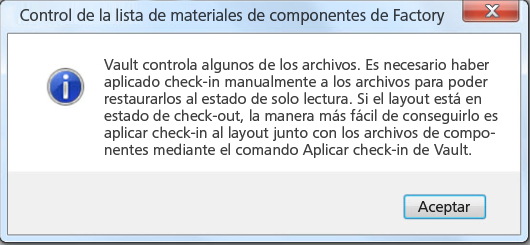 Si selecciona el comando Control de componentes y, a continuación, selecciona Restaurar todos los archivos de componentes al estado de solo lectura, el cuadro de diálogo siguiente le recordará que debe aplicar check-in a los archivos manualmente. Esta acción cambiará todos los archivos controlados en Vault al estado de solo lectura.