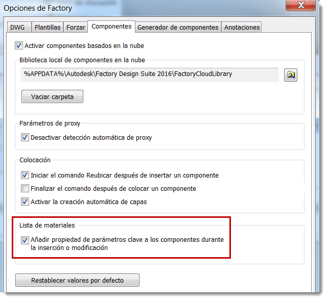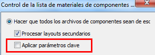 Active la casilla de verificación debajo de Lista de materiales para visualizar los parámetros clave del componente después de generar la lista de materiales. Si no selecciona la casilla de verificación debajo de Opciones de Factory, también podrá añadir parámetros clave bajo Control de la lista de materiales.
